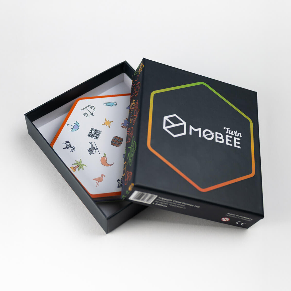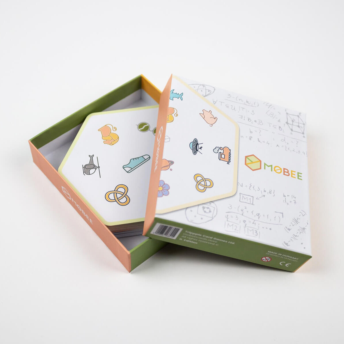 Møbee ist ein Kartenspiel mit einer wichtigen Regel: Dreht 3 Karten um und findet das gemeinsame Symbol! Der Schnellste gewinnt!